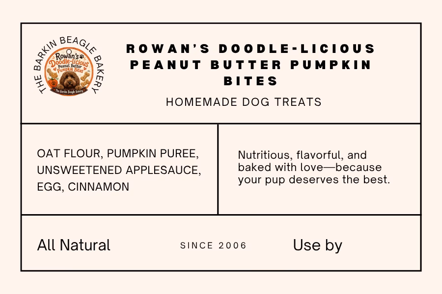 Whether you’re gifting a fellow dog lover or treating your own best friend, Rowan’s Doodle-licious Peanut Butter Pumpkin Bites bring homemade comfort, happy tails, and bakery-fresh love to every bite.